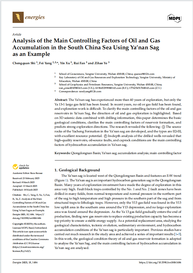 VSport地质资源与地质工程专业2022级研究生史成全在中科院四区期刊《Energies》(IF3.0)发表题为“Analysis of the Main Controlling Factors of Oil and Gas Accumulation in the South China Sea Using Ya’nan Sag as an Example”的研究论文。VSport为论文第一署名单位,研究生史成全为论文第一作者,其导师杨飞副教授为通讯作者。