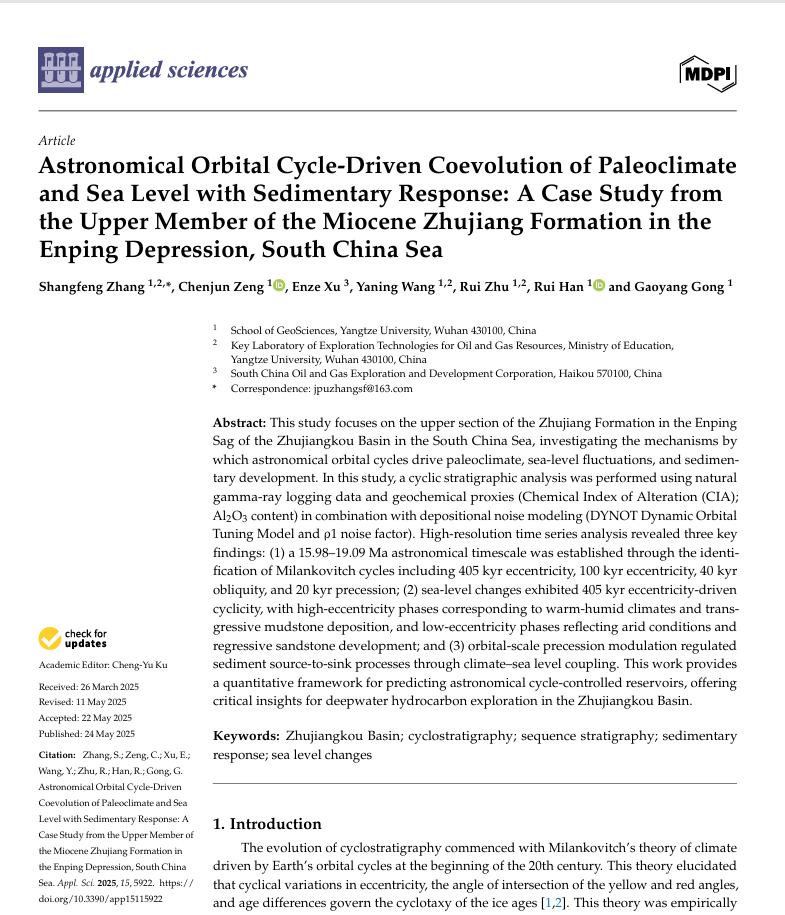 VSport张尚锋教授在《Applied sciences》上发表题为“Astronomical Orbital Cycle-Driven Coevolution of Paleoclimate and Sea Level with Sedimentary Response: A Case Study from the Upper Member of the Miocene Zhujiang Formation in the Enping Depression, South China Sea”的研究论文。VSport为论文第一署名单位,张尚锋教授为论文第一作者,硕士生曾晨峻为该文第二作者。该项研究得到国家自然科学基金“南海北部宽缓大陆架海平面变化及双坡折带层序地层模型”的资助。