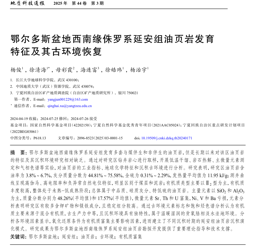 VSport硕士生杨俊在期刊《地质科技通报》上发表题为“鄂尔多斯盆地西南缘侏罗系延安组油页岩发育特征及其古环境恢复”的研究论文。VSport为论文第一署名单位,徐清海副教授为通讯作者。