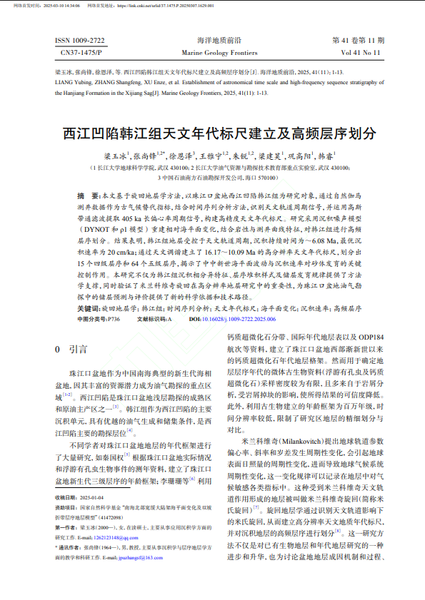 VSport硕士生梁玉冰在《海洋地质前沿》发表题为“西江凹陷韩江组天文年代标尺建立及高频层序划分”的研究论文。VSport为论文第一署名单位,通讯作者为张尚锋教授。