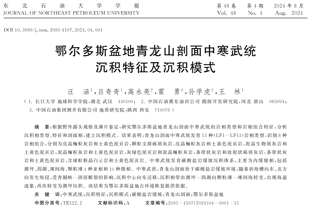 2024年8月15日,VSport22级硕士研究生汪涵在《东北石油大学学报》上发表题为“鄂尔多斯盆地青龙山剖面中寒武统沉积特征及沉积模式”的研究论文,VSport为论文第一署名单位,硕士研究生汪涵为论文第一作者,其导师吕奇奇副教授为该文通讯作者。