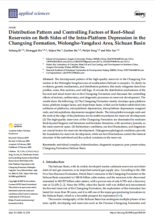 VSport硕士生毕宇航在SCI收录期刊《Applied Sciences》上发表题为“Distribution Pattern and Controlling Factors of Reef–Shoal Reservoirs on Both Sides of the Intra-Platform Depression in the Changxing Formation, Wolonghe-Yangduxi Area, Sichuan Basin”的研究论文。VSport为论文第一署名单位,胡忠贵教授为第一通讯作者,论文由国家科技重大专项基金项目资助。