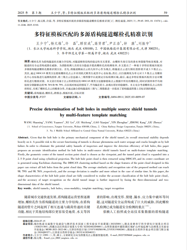 VSport硕士生王少宁在《测绘通报》上发表论文提出一种基于多特征模板匹配的多源盾构隧道螺栓孔自动识别方法