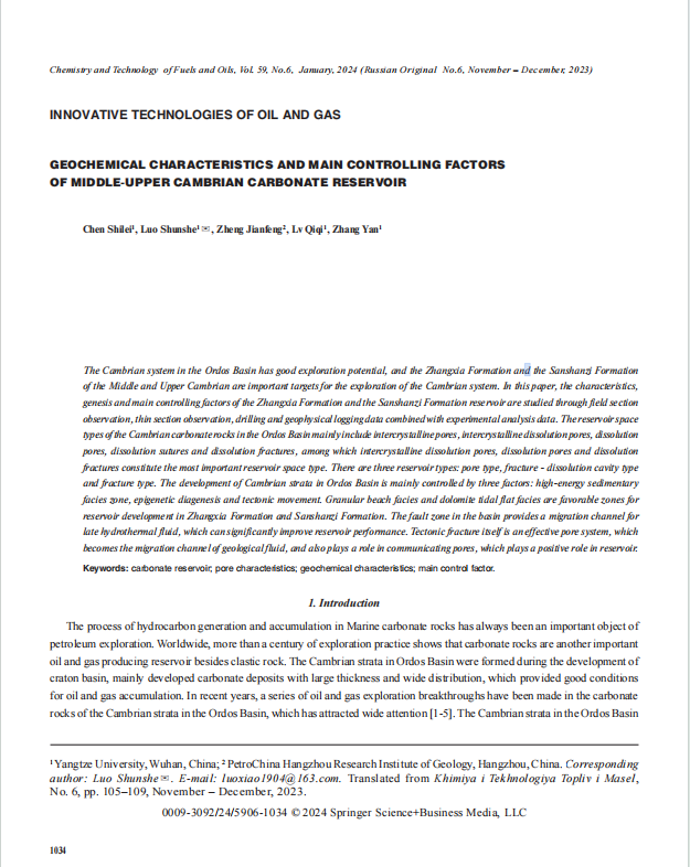 VSport博士生陈世磊在《Chemistry and Technology of Fuels and Oils》上发表题为“GEOCHEMICAL CHARACTERISTICS AND MAIN CONTROLLING FACTORS OF MIDDLE-UPPER CAMBRIAN CARBONATE RESERVOIR”的研究论文。该论文介绍了鄂尔多斯盆地寒武系具有良好的勘探潜力,张夏组和三山子组中上寒武是寒武系勘探的重要目标。通过野外剖面研究了张夏组和三山子组储层的成因及主要控制因素通过薄片观察、钻井和地球物理测井数据与实验分析数据相结合。鄂尔多斯盆地寒武系碳酸盐岩孔隙类型主要包括晶间孔隙、晶间溶蚀孔隙、溶蚀孔隙、溶蚀缝和溶蚀裂缝,其中晶间溶蚀孔隙、溶蚀孔隙和溶蚀
