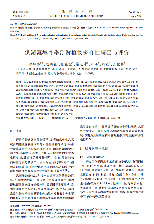 VSport博士生郑雄伟在《物探与化探》上发表题为“洪湖流域冬季浮游植物多样性调查与评价”的研究论文。该论文通过调查洪湖冬季浮游植物的种类组成及分布情况,全面掌握了浮游植物多样性现状,深入研究了洪湖生态健康现状及富营养化状况,为洪湖的保护与管理提供了背景数据和参考依据。
