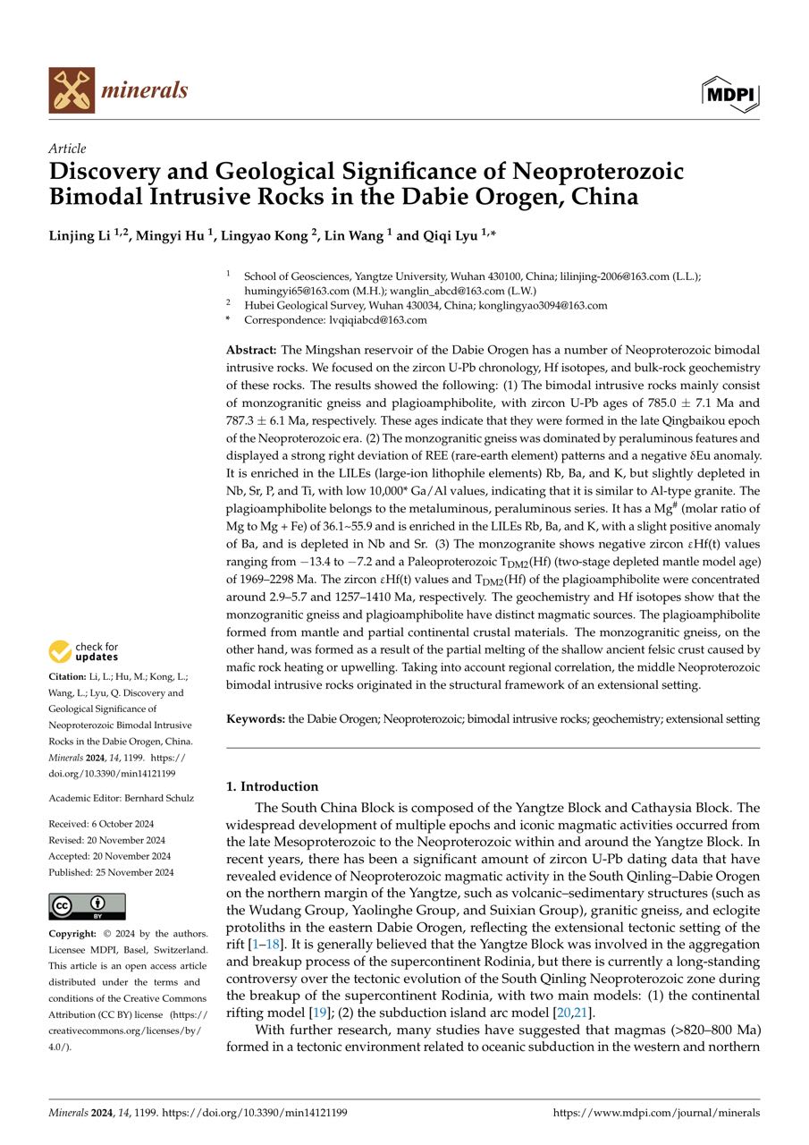 VSport地质系胡明毅教授团队长期从事地质学方向的研究。团队成员李琳静博士在期刊《Minerals》上发表题为《Discovery and Geological Significance of NeoproterozoicBimodal Intrusive Rocks in the Dabie Orogen, China》的研究论文,VSport为论文第一署名单位,博士生李琳静为论文第一作者。