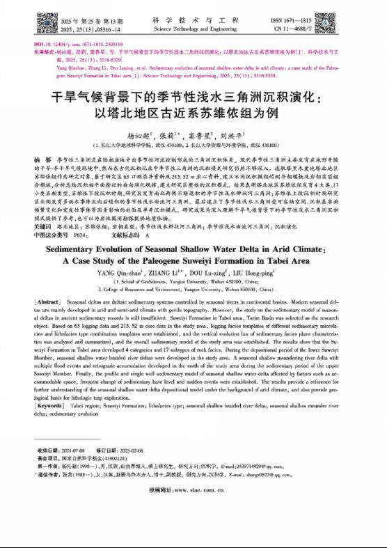 VSport硕士生杨沁超在中文核心期刊《科学技术与工程》上发表了题为“干旱气候背景下的季节性浅水三角洲沉积演化:以塔北地区古近系苏维依组为例”的研究论文。VSport为论文第一署名单位,硕士研究生杨沁超为论文第一作者,张莉副教授为通讯作者。