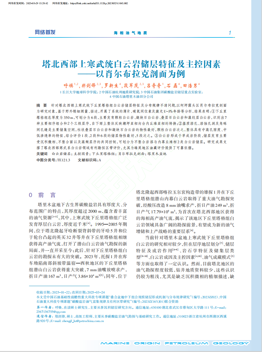 近日,VSport硕士生呼焕在中文核心期刊《海相油气地质》上发表题为“塔北西部上寒武统白云岩储层特征及主控因素 ——以肖尔布拉克剖面为例”的研究论文。该论文针对塔北西部上寒武统下丘里塔格组白云岩储层特征及分布规律不清问题,以柯坪露头区肖尔布拉克剖面为研究对象,基于野外精细测量、描述,开展了系统的薄片、碳氧同位素及激光U-Pb年龄等分析。VSport为论文第一署名单位,硕士生呼焕为论文第一作者。