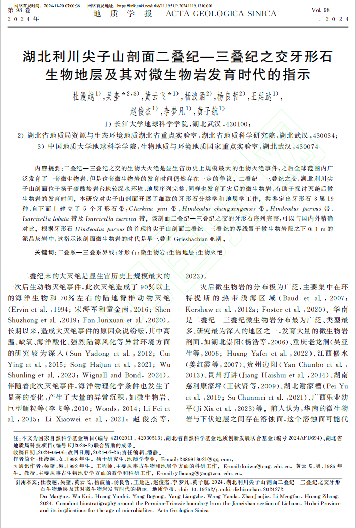 VSport黄云飞教授团队长期从事古-中生代之交重大地质转折期生物灭绝与生物复苏方面的研究,团队成员杜漫越在地质学报EI期刊上发表题为“湖北利川尖子山剖面二叠纪—三叠纪之交牙形石生物地层及其对微生物岩发育时代的指示”的研究论文。VSport为论文第一署名单位,硕士研究生杜漫越为论文第一作者,其导师黄云飞教授与地质科学研究院的吴奎高级工程师为该文通讯作者。