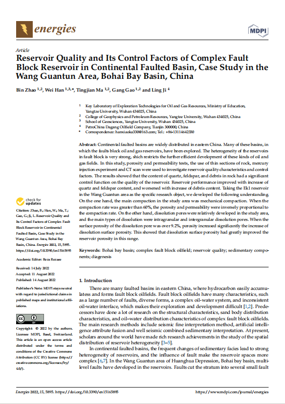 VSport硕士生韩微在《Energies》发表题为“Reservoir Quality and Its Control Factors of Complex Fault Block Reservoir in Continental Faulted Basin, Case Study in the Wang Guantun Area, Bohai Bay Basin, China”的研究论文。文章主要研究中国东部广泛分布着陆相断陷盆地中碎屑岩储层的储层质量及控制因素。断层对油气藏具有封堵作用,断块内储层非均质性极强,严重制约了此类油气田的高效开发。本研究通过孔隙度与渗透率测试、岩石薄片鉴定、压汞实验及CT扫描等技术手段,系统分析了储层质量特征及其控制因素。结果表明:岩石中石英、长石与岩屑含量对储层质量具有显著控制作用——石英与长石含量增加时储层物性改善,岩屑含量增加时储层物性恶化。以王官屯地区EKI储层为具体研究对象,得出以下认识:一方面,研究区压实作用以机械压实为主,当压实率超过60%时,孔隙度与渗透率随压实率增大而降低;另一方面,研究区溶蚀孔隙较发育,主要发育粒内溶孔与粒间溶孔两类,当溶蚀面孔率超过9.2%时,孔隙度随溶蚀面孔率增大显著提升,表明该区间溶蚀作用对储层孔隙改善效果显著。