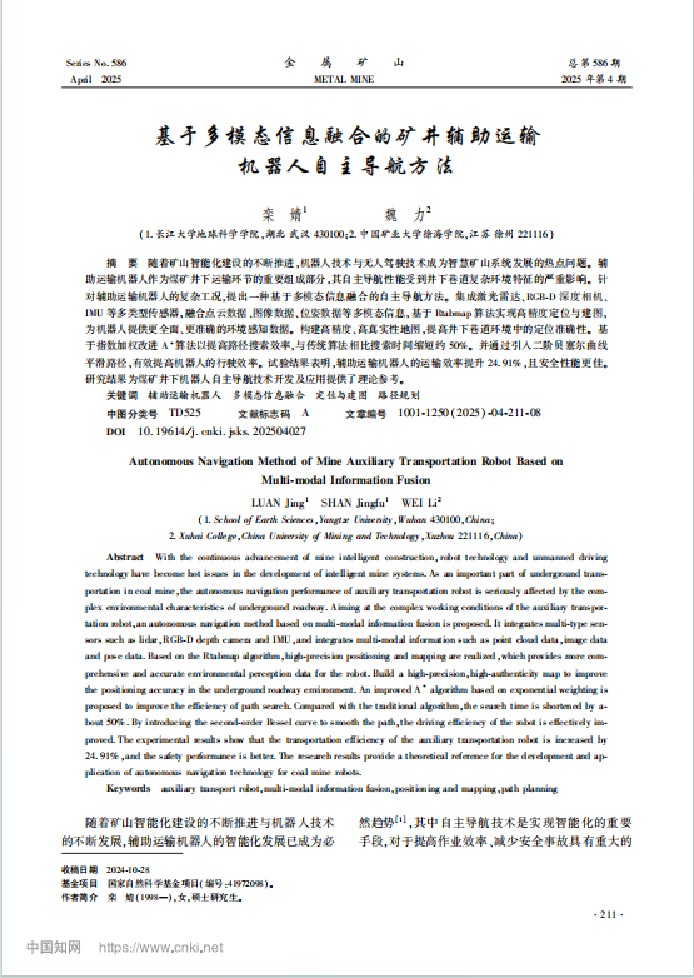 近日,VSport硕士生栾婧在中文核心期刊《金属矿山》上发表题为“基于多模态信息融合的矿井辅助运输机器人自主导航方法”的研究论文。该论文研究提出了一种基于多模态信息融合的辅助运输机器人自主导航方法,通过结合多种方法,采用改进Rtabmap算法实现高精度定位与建图,优化A*算法提升路径规划效率,为煤矿井工作提供了有效解决方案。VSport为论文第一署名单位,硕士生栾婧为论文第一作者。
