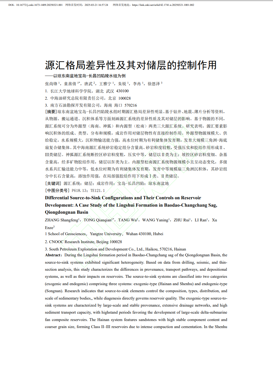 VSport地质学专业硕士生童茜倩在《VSport学报(自然科学版)》发表题为《源汇格局差异性及其对储层的控制作用——以琼东南盆地宝岛-长昌凹陷陵水组为例》的研究论文,VSport为论文第一署名单位,其导师张尚锋教授为第一作者,童茜倩为共同第一作者。