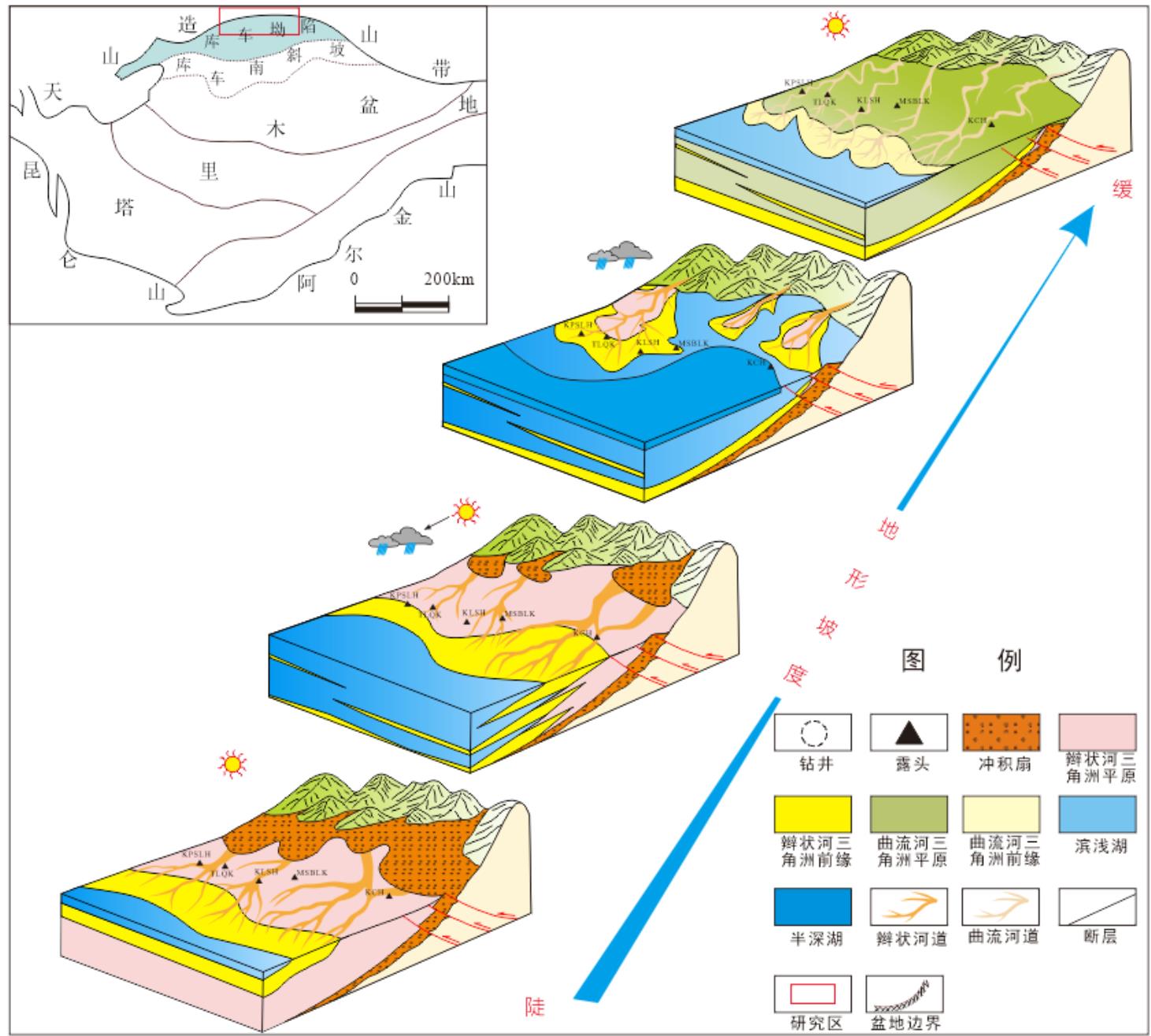图1库车前陆盆地三叠系构造-沉积充填演化模式图