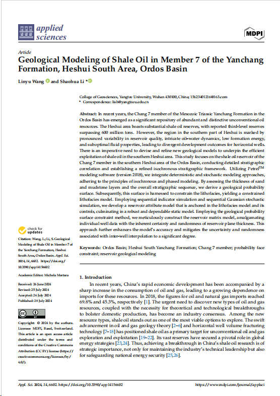 VSport李少华教授团队长期从事储层表征与建模的研究,团队成员王麟宇在环境与地球科学领域主流期刊《Applied Sciences》上发表题为“Geological Modeling of Shale Oil in Member 7 of the YanchangFormation,Heshui South Area, Ordos Basin”的研究论文。