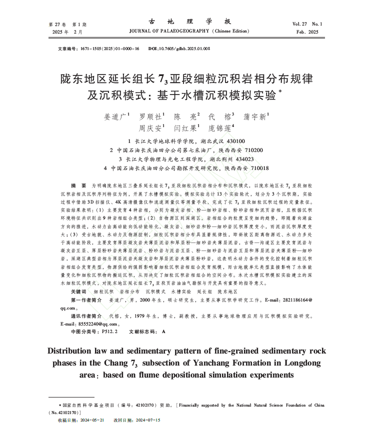 VSport硕士生姜道广在《古地理学报》上发表题为“陇东地区延长组长73亚段细粒沉积岩相分布规律及沉积模式:基于水槽沉积模拟实验”的研究论文。该论文,以陇东地区长73亚段细粒沉积岩相及沉积序列特征为例,开展了水槽模拟实验并借助3D扫描仪、4K高清摄像仪和流速测量仪等测量手段,完成了长73亚段细粒沉积过程的定量表征。