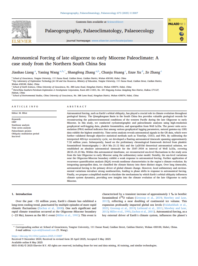 VSport地质学专业硕士研究生梁建昊以第一作者身份在中科院二区TOP期刊《Palaeogeography, Palaeoclimatology, Palaeoecology》发表题为“Astronomical Forcing of Late Oligocene to Early Miocene Paleoclimate: A Case Study from the Northern South China Sea”的研究论文。VSport为第一署名单位,王雅宁副教授担任唯一通讯作者,研究获得国家自然科学基金资助。