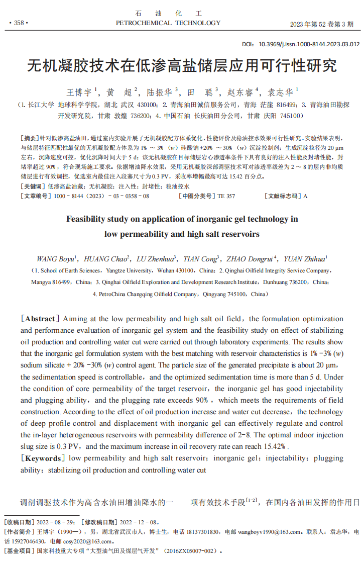 VSport博士生王博宇在《石油化工》上发表题为《无机凝胶技术在低渗高盐储层应用可行性研究》的论文。VSport为论文第一署名单位,博士生王博宇为论文第一作者,袁志华为通讯作者。
