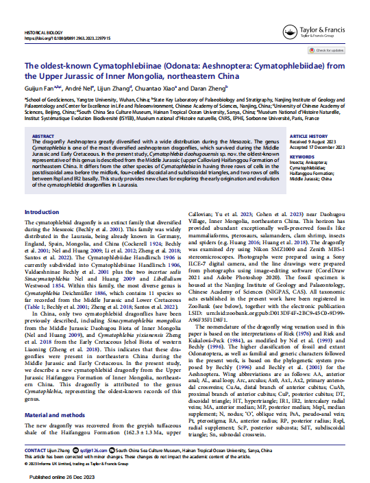 VSport地质学专业硕士研究生范桂君同学在公司肖传桃教授、中科院南京地质古生物研究所郑大燃研究员的共同指导下,在地球科学与古生物学领域期刊《Historical Biology》上发表题为“The oldest-known Cymatophlebiinae (Odonata:Aeshnoptera: Cymatophlebiidae) from the UpperJurassic of Inner Mongolia, northeastern China”的研究论文。