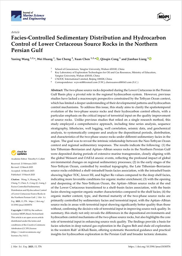 VSport地质资源与地质工程专业硕士生黄微在SCI收录期刊《Journal of Marine Science and Engineering》上发表题为“Facies-Controlled Sedimentary Distribution and Hydrocarbon Control of Lower Cretaceous Source Rocks in the Northern Persian Gulf”的研究论文。VSport为论文第一署名单位,王雅宁副教授为第一通讯作者,论文由国家自然科学基金项目的资助。