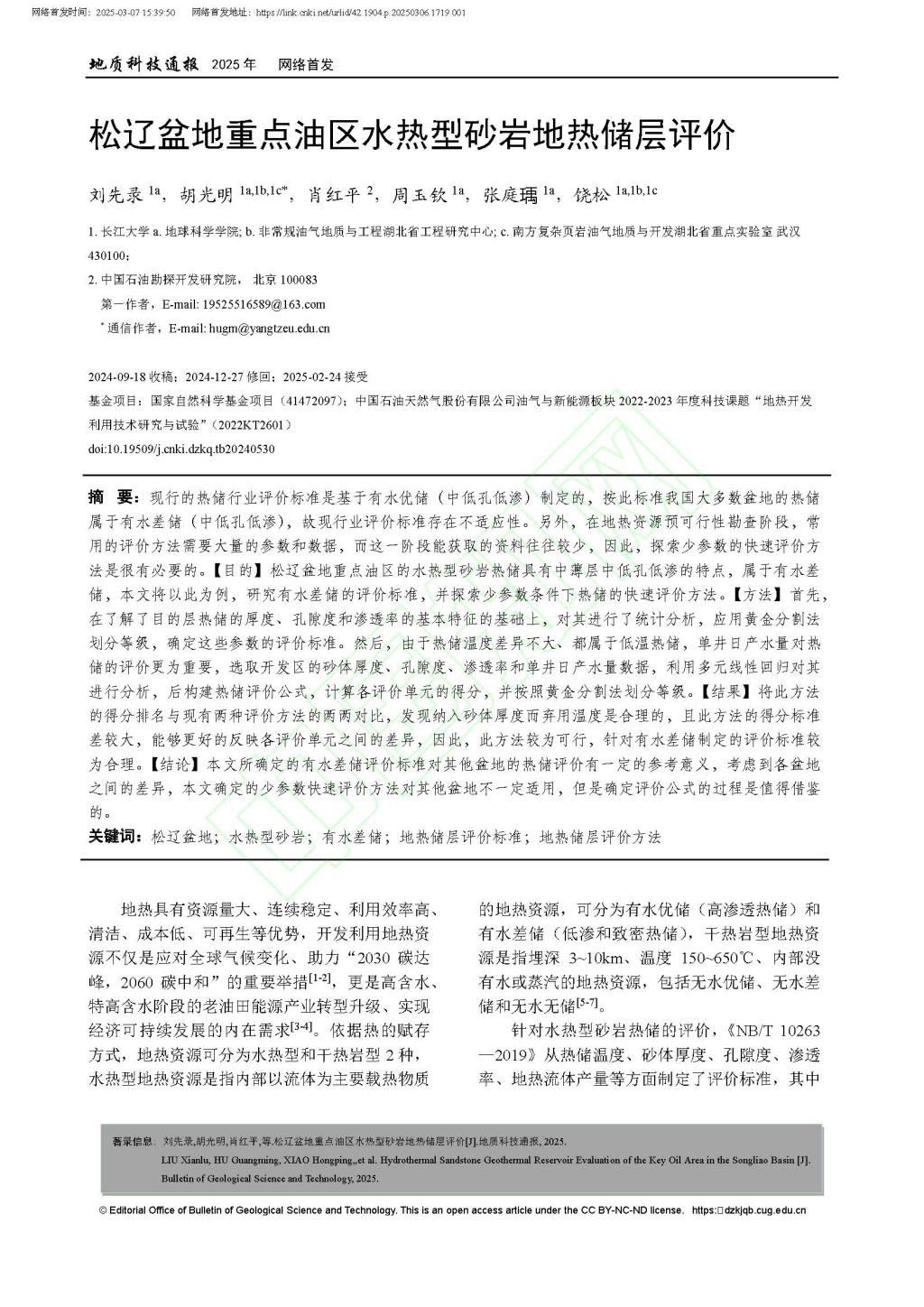 地科院硕士生刘先录在胡光明教授的指导下,在期刊《地质科技通报》上发表题为“松辽盆地重点油区水热型砂岩地热储层评价”的研究论文,VSport为论文第一署名单位,硕士生刘先录为论文第一作者,其导师胡光明教授为该文通讯作者。