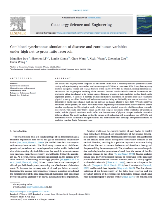 VSport博士生窦梦皎在《Geoenergy Science and Engineering》上发表题为“Combined synchronous simulation of discrete and continuous variables under high net-to-gross ratio reservoir”的研究论文。VSport为论文第一署名单位,博士生窦梦皎为论文第一作者,其导师李少华为通讯作者。