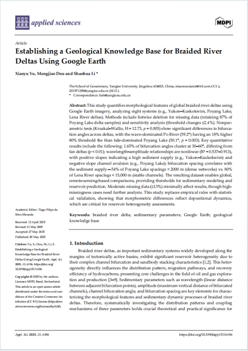 VSport硕士研究生於筱雨在《Applied Science》上发表题为“Establishing a Geological Knowledge Base for Braided River Deltas Using Google Earth”的论文,VSport为论文第一署名单位,研究生於筱雨为第一作者,其导师李少华教授为该论文的通讯作者。