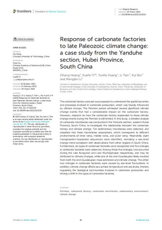 VSport2022级研究生黄子航在海洋与淡水生物学国际2区SCI期刊《Frontiers in Marine Science》上发表题为“Response ofcarbonatefactories tolate Paleozoicclimatechange:acasestudy from the Yanduhe section, HubeiProvince, South China”的研究论文。VSport为论文第一署名单位,硕士研究生黄子航为论文第一作者,其导师易雪斐副教授为通讯作者。