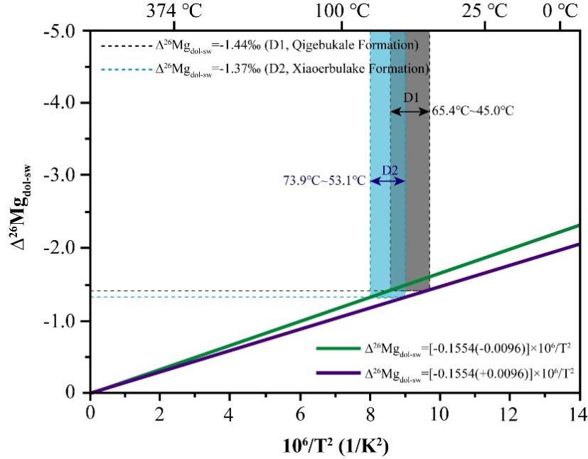 由于镁同位素在白云石的成岩过程中具有稳定性,而且同位素平衡分馏与温度之间存在较强的关系,因此镁同位素成为估算白云石形成温度的一个有前景的工具(Li et al., 2023 a, b)。在本研究中,我们分析了来自中国塔里木盆地自寒武纪到奥陶纪的不同白云石样品的镁同位素组成(δ26Mg),以评估镁同位素作为白云石温度计的潜力(图2)。