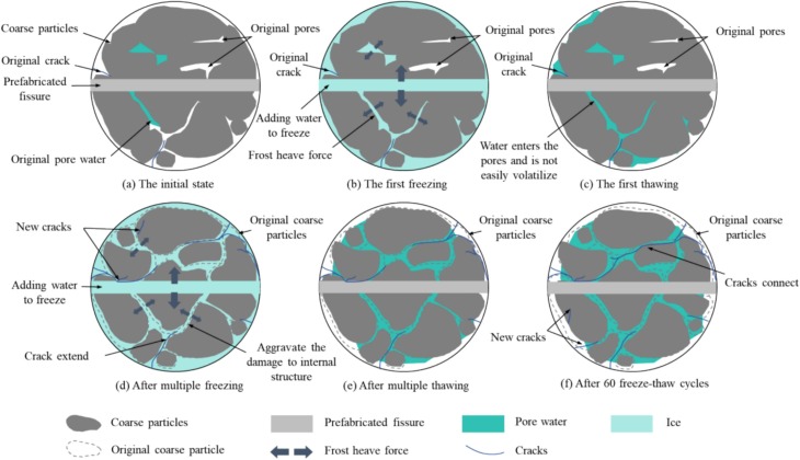 图2 冻融循环作用下预制裂隙砾岩内部结构演化示意图