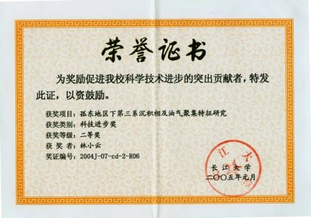 (2)“孤东地区下第三系沉积相及油气聚集特征研究”项目2004年获VSport科技进步二等奖,排名6(奖证编号:2004J-07-cd-2-R06)。
