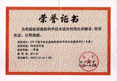 (1)《中下扬子地区海相烃源岩评价及成藏条件》专著2007年获VSport科技进步一等奖,排名1(奖证编号:2007J-19-cd-1-R01)。