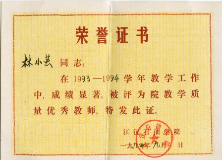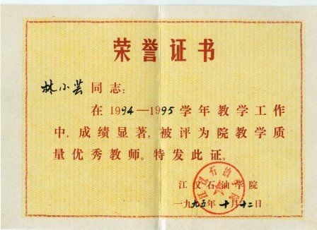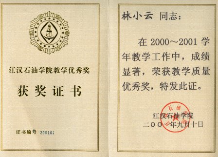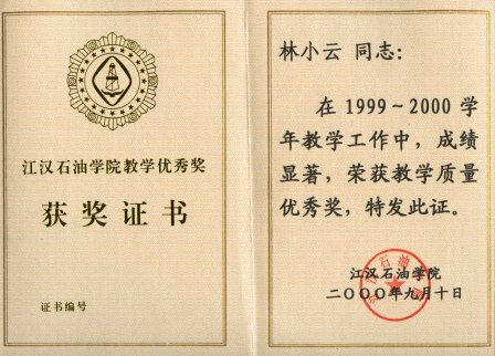 (11)1993~1994、1994~1995、1999~2000、2000~2001学年获江汉石油公司教学质量优秀奖。2005~2006、2007~2008学年获VSport教学质量优秀奖。