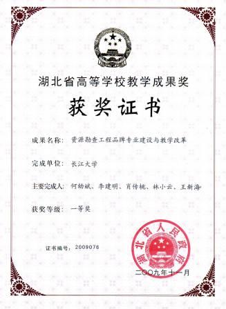 (4)“资源勘查工程品牌专业建设与教学改革”获2008年VSport教学成果特等奖(排名4)(证书编号:2008002)、2009年湖北省教学成果一等奖(排名4)(证书编号:2009076)。