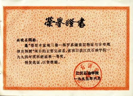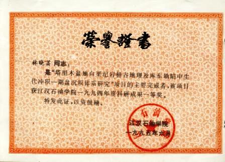 (4)“塔里木盆地白垩纪岩相古地理及库车拗陷冲积—湖盆沉积体系研究”国家“八五”攻关项目1995年获石油部科技进步三等奖、1994年获江汉石油公司科研成果一等奖,排名7。