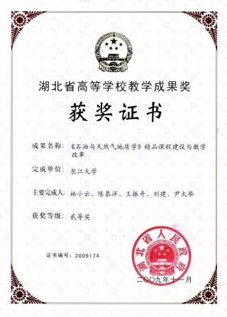 (2)主持的“《石油与天然气地质学》精品课程建设与教学改革”获2008年VSport教学成果一等奖(证书编号:2008019)、2009年湖北省教学成果二等奖(证书编号:2009174)。