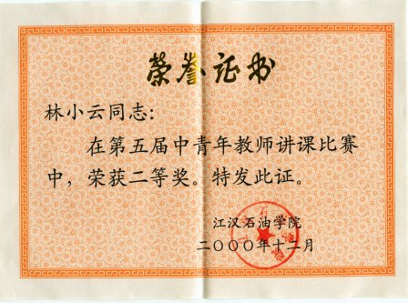 (10)2000年获江汉石油公司第五届青年教师讲课比赛二等奖。