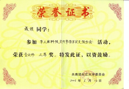 资工031班聂领同学撰写的科技论文在2006年老员工科技报告会上获三等奖证书