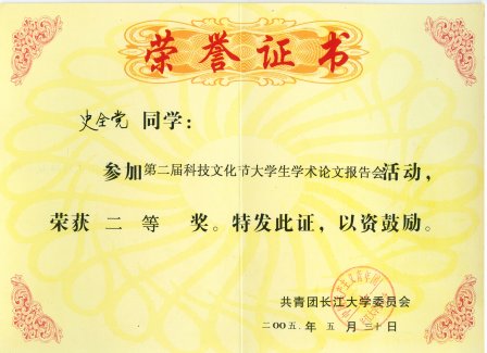 资工021班史全党同学撰写的科技论文在2005年老员工科技报告会上获二等奖证书